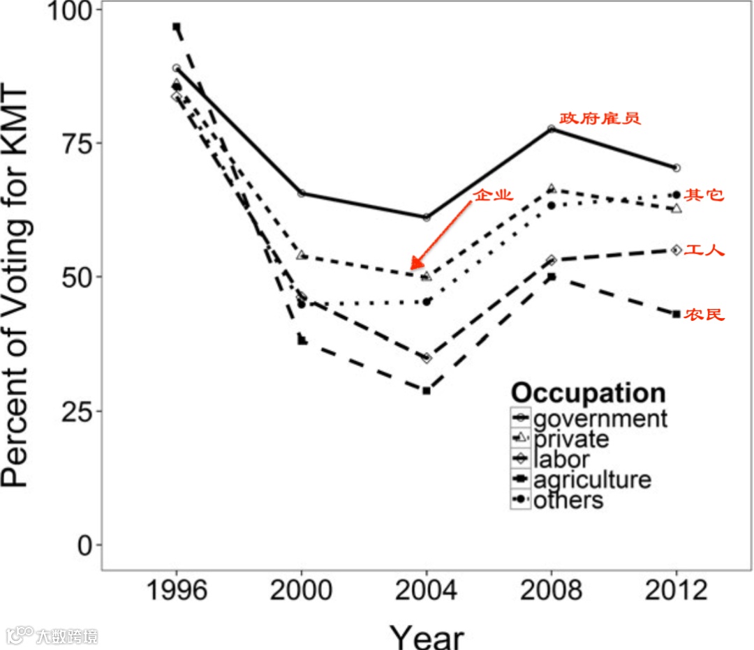 总体来看,在公共部门工作的人,比如政府雇员、教师、军人等,高度支持国民党及泛蓝阵营;在非公共部门工作的人,尤其是在大城市工作的群体,比如企业员工,也比较支持国民党。