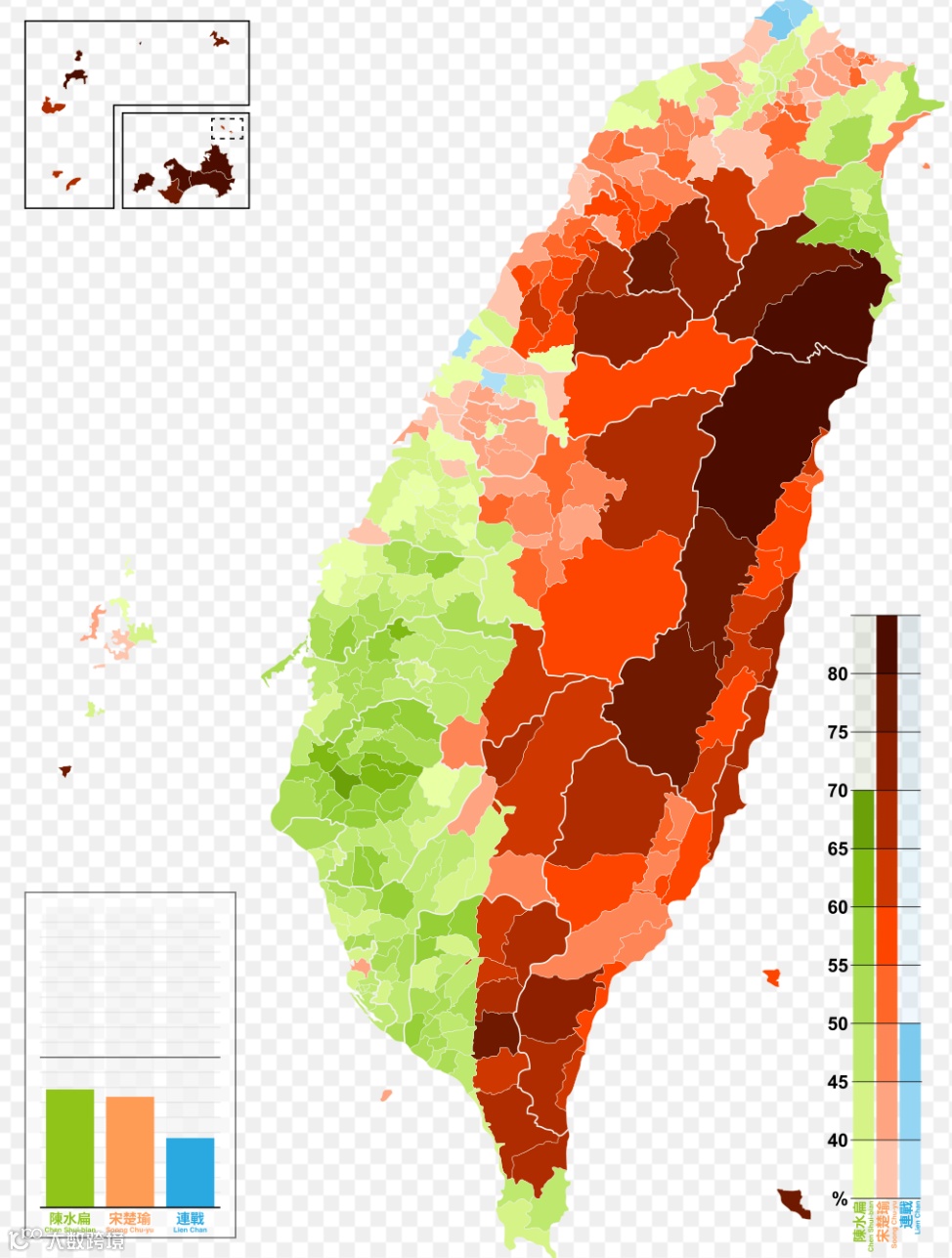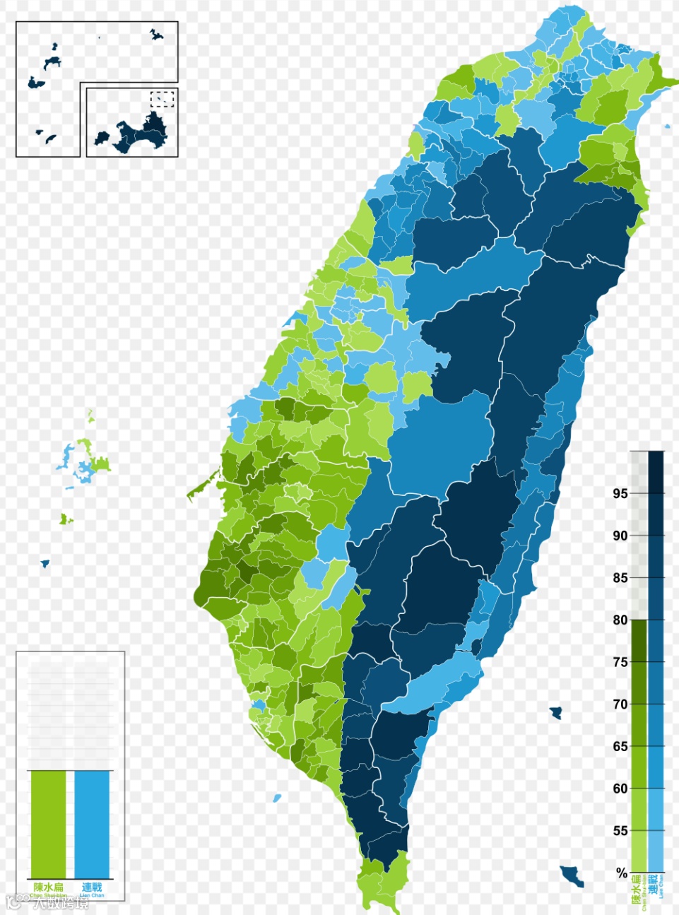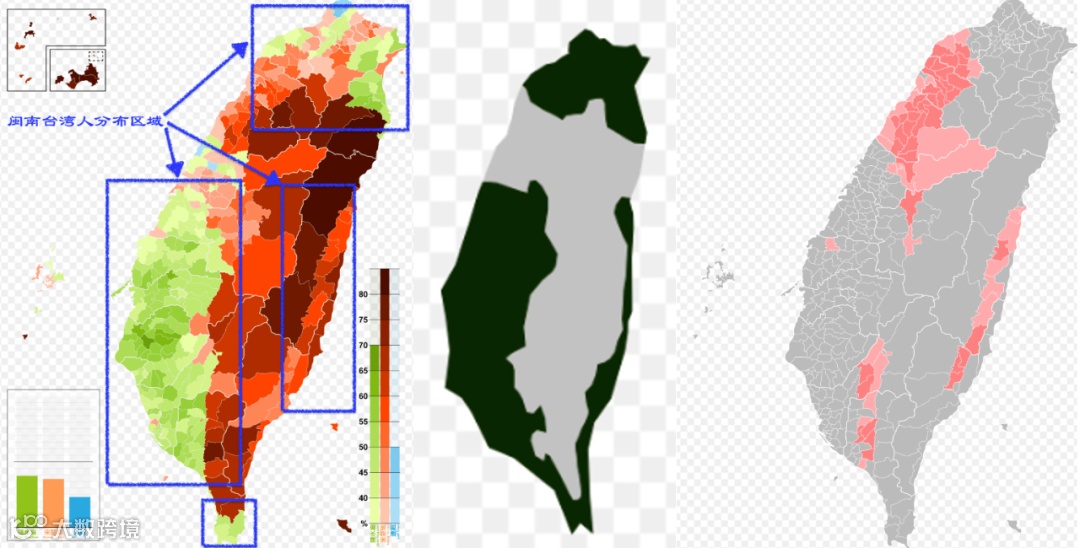 说明:2000年选举中选民支持情况以及闽南台湾人和客家台湾人分布地图.