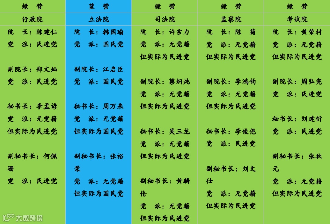 下面这张图,显示的就是目前台湾政治中国民党(蓝营)和民进党(绿营)在台北的权力分布情况。可以看出,台湾的行政院、司法院、监察院和考试院,基本都在民进党手中(用绿色表示),只有立法院在国民党手里(用蓝色表示)。
