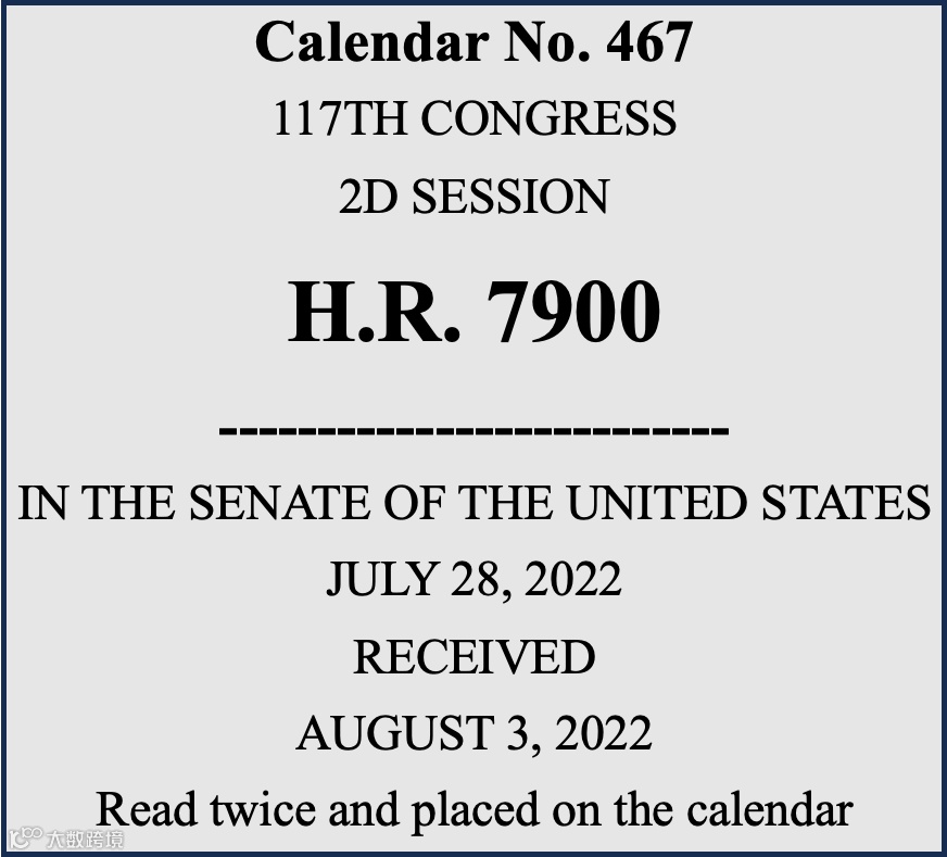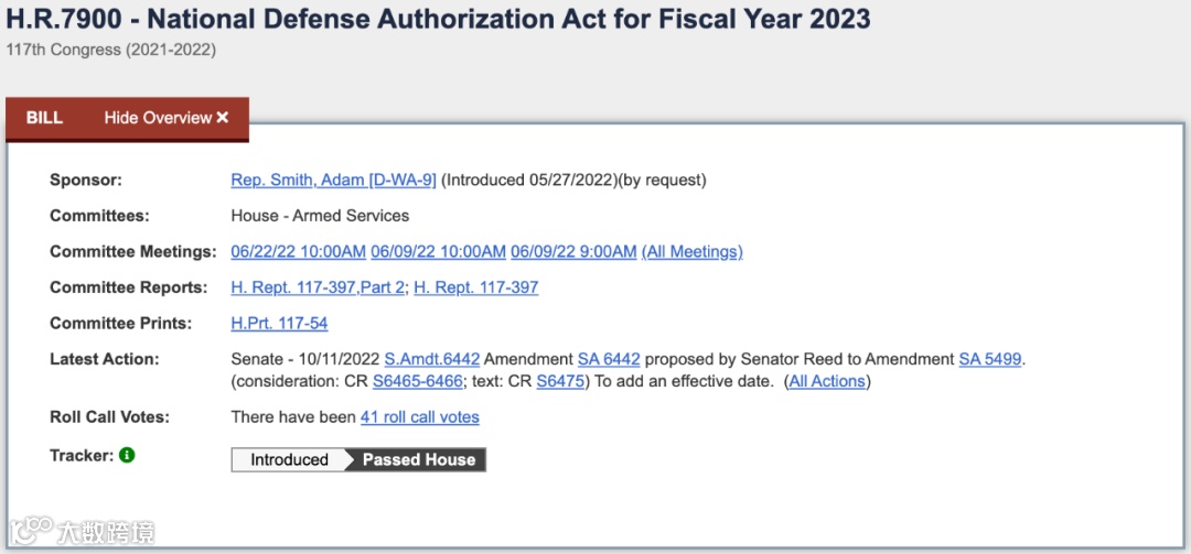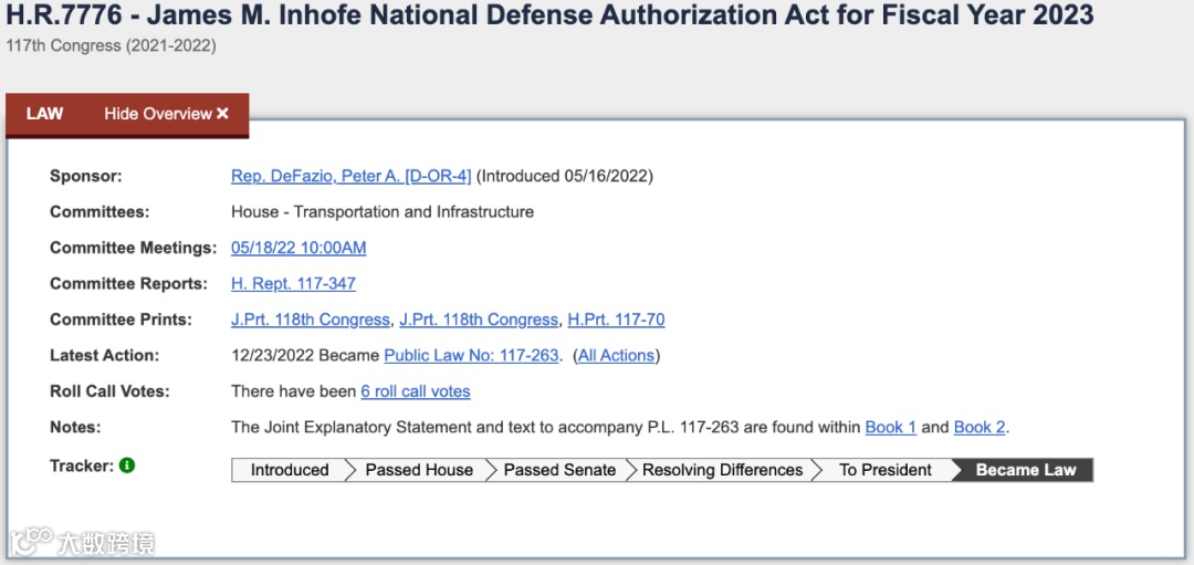 2022年12月8日,众议院就通过了H.R.7776议案(即《国防授权法》议案),随后议案被送交参议院表决。