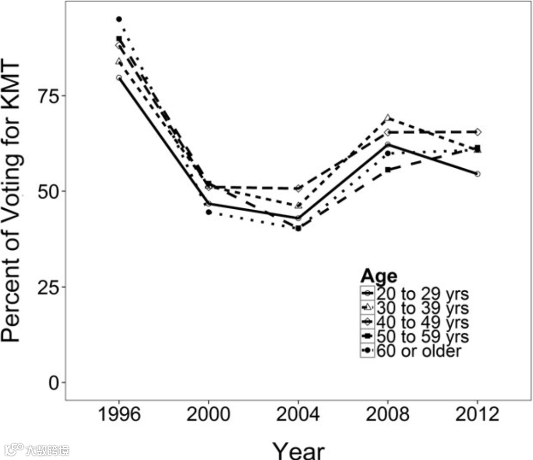 下图显示了从1996年到2012年的四次选举中,不同年龄段选民对国民党的支持率。可以看出,30岁到49岁这部分选民对国民党的支持率最高,50岁以上的选民对国民党的支持率相对较低。