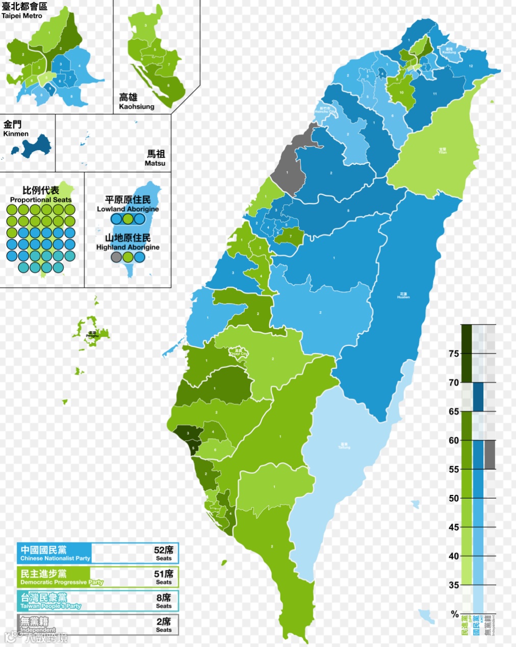 通过上面几张表格可以看出,虽然在台北,行政权基本握在民进党手中,但是在地方,国民党的势力还是相当大的。