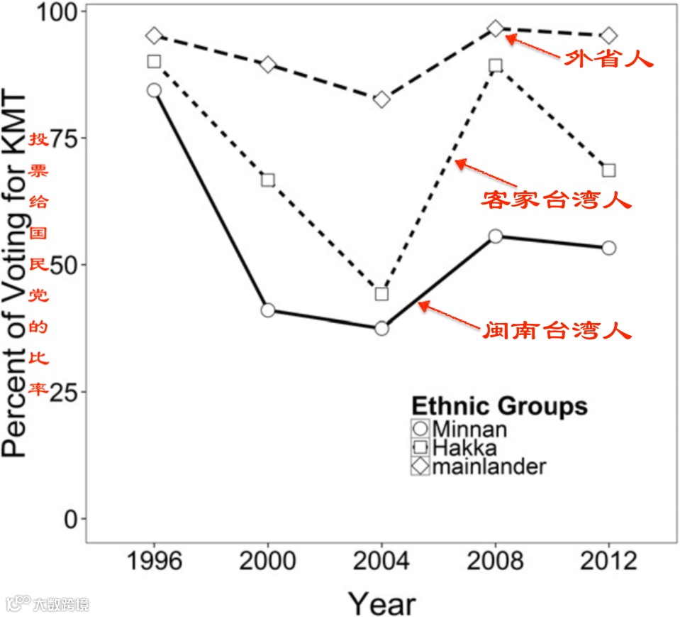 说明:1996年到2012年台湾不同年龄群体对国民党的支持率.