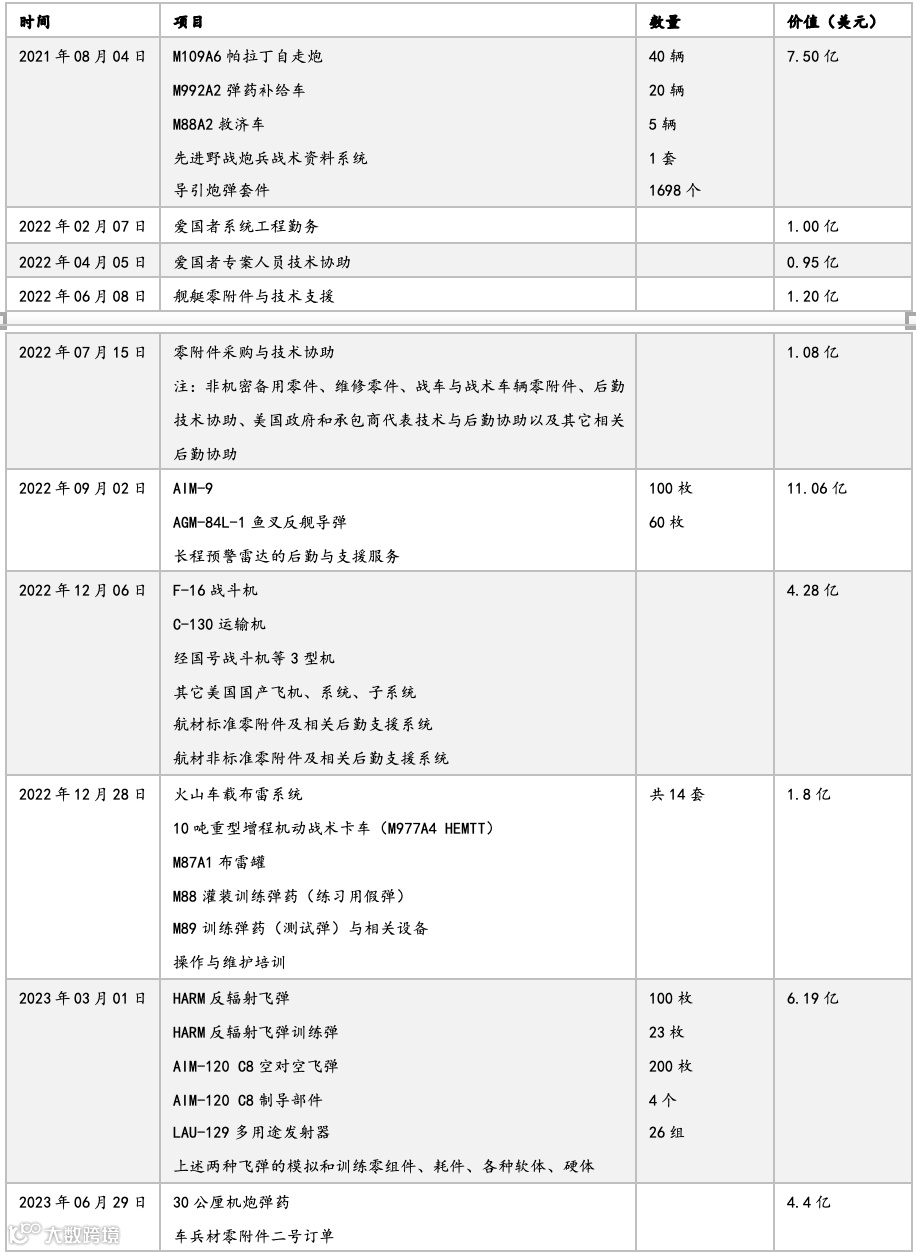比如,《强化台湾韧性法》将原先《台湾政策法》中针对台湾省的4年45亿美元军事援助拨款,增加到5年100亿美元,增加了1倍以上。下图是拜登政府至今对台军事援助的大致清单。