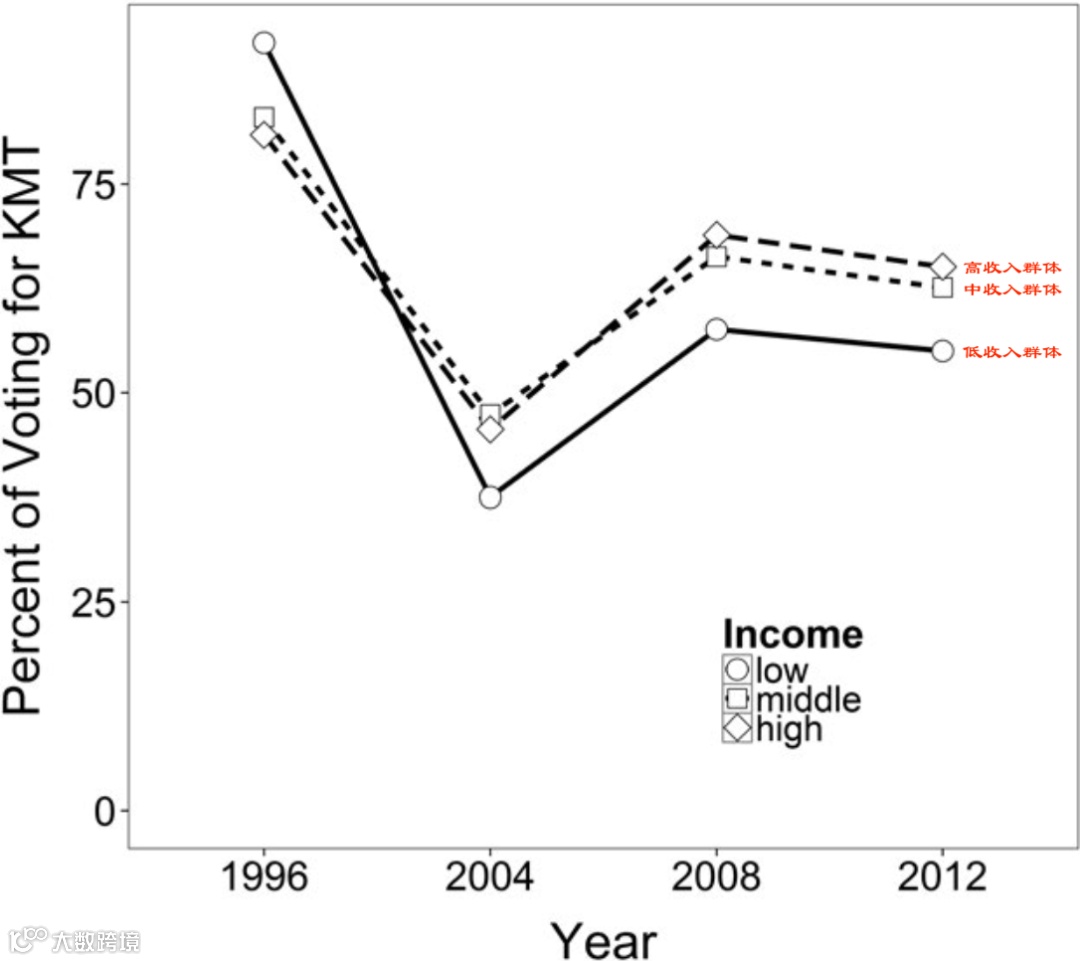 说明:1996年到2012年台湾不同收入群体对国民党的支持率.