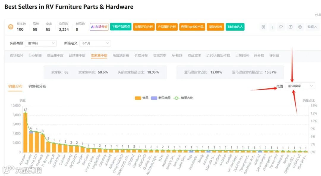 不少新进 Top 100的卖家都只靠一款产品。我会点进店铺看看,如果他们的店铺很杂,不垂直,那可能说明这个类目的进入门槛不高。 - 黄色箭头(卖家产品数量):