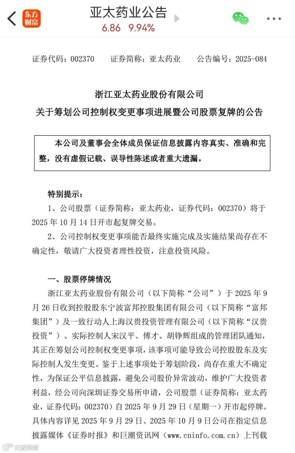 10月14日,亚太药业(002370)发布公告称,公司控股股东富邦集团及一致行动人拟以每股8.26元的价格,向浙江星浩控股及其一致行动人转让公司14.61%股份,转让总价达9亿元。