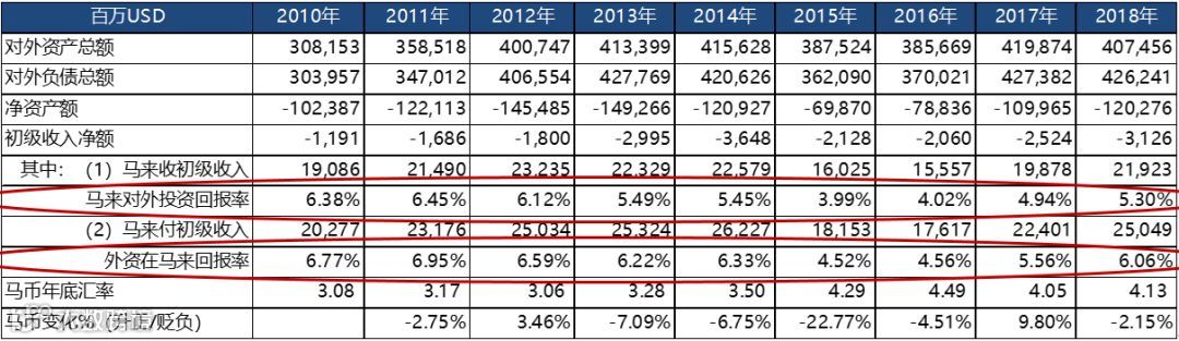 外资在马来回报率=马来付初级收入/((上一年底对外负债总额+本年底对外负债总额)/2)