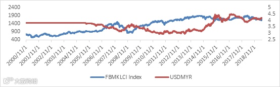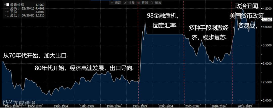 汇率走势:1972年,从锚定英镑改为美元,1975年从固定汇率改为盯一揽子货币的浮动汇率,70~96年,USD/MYR汇率在2.1~3.1间波动。