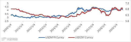 目前马来国内政治环境相对稳定,外汇储备的变动情况可以间接反映汇率的走势情况。马来外汇储备近十年来均值$1139亿,峰值为2012年$1396亿,2019Q1为$1034亿,相比峰值下跌约26%。