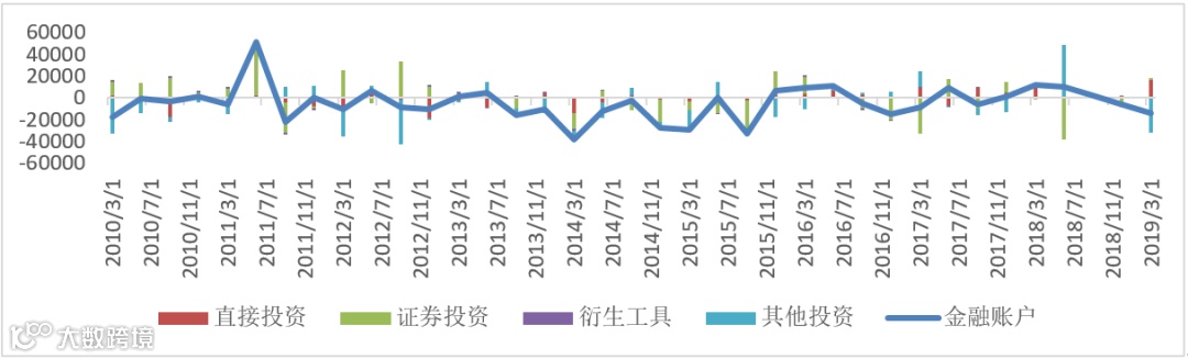 2.2金融账户:呈现净流出趋势,平均每季度流出$11亿,主要包括直接投资、证券投资、衍生工具和其他投资,其中证券投资和其他投资占比越来越高。