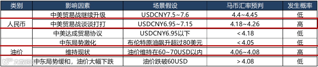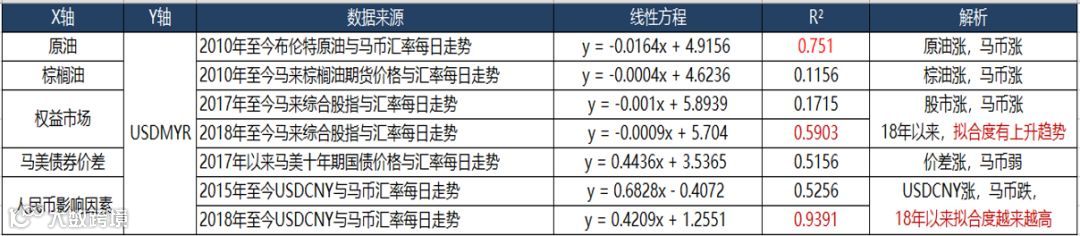 将马币汇率分别与石油、棕榈油、债券收益、权益市场回报率、人民币汇率五个影响因素进行相关性分析,测算出当前环境下,与马币走势相关性拟合度最高的是人民币和油价。