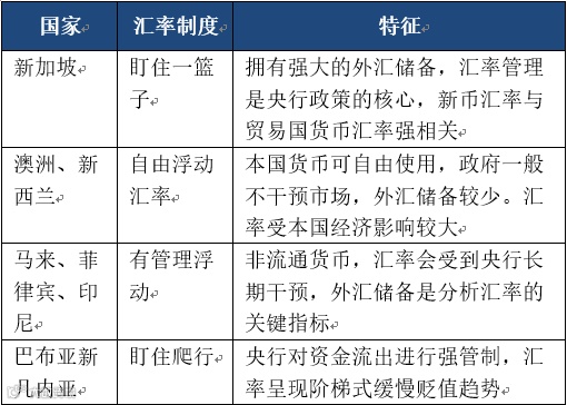 影响汇率的因素很多,国家竞争力、政治环境、全球经济周期、开放度、财政政策、货币政策、资本管制程度等都会影响汇率走势。本文基于目前稳定的政治经济环境,从国际收支的角度分析马来西亚林吉特(以下简称“马币”)汇率的影响因素。外汇供需关系结果的体现是外汇储备量,外汇储备的构成是本文的核心。当然,一个国家处于不同的发展阶段,使用不同的汇率制度,对外汇储备的需求量也会不同。南太平洋地区目前情况如下: