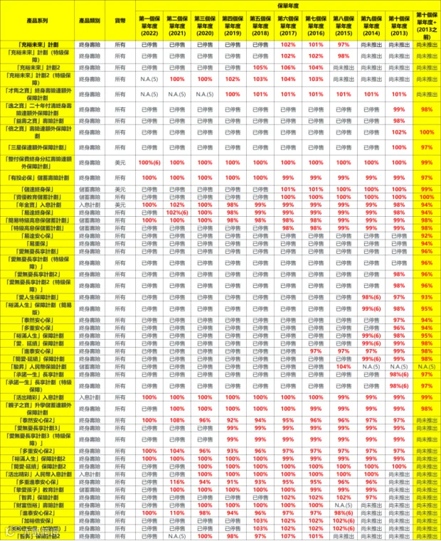 如图所示,五六十款分红产品,相当多的都是有10年以上的分红率数据,可以看到基本都在97%-106% 区间。