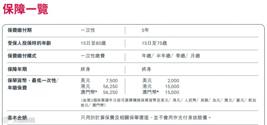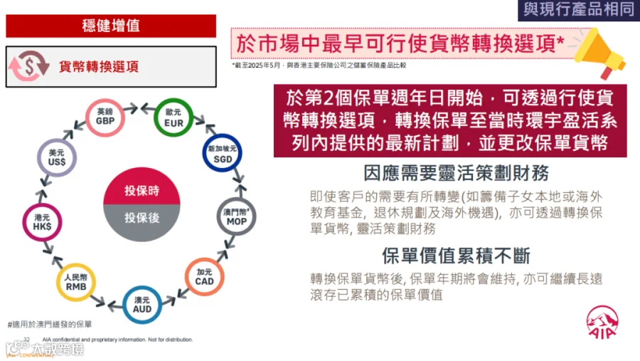保单支持美元、港元、澳门币投保,从第2年开始,可以转换成9种货币,包括人民币、英镑、欧元等。