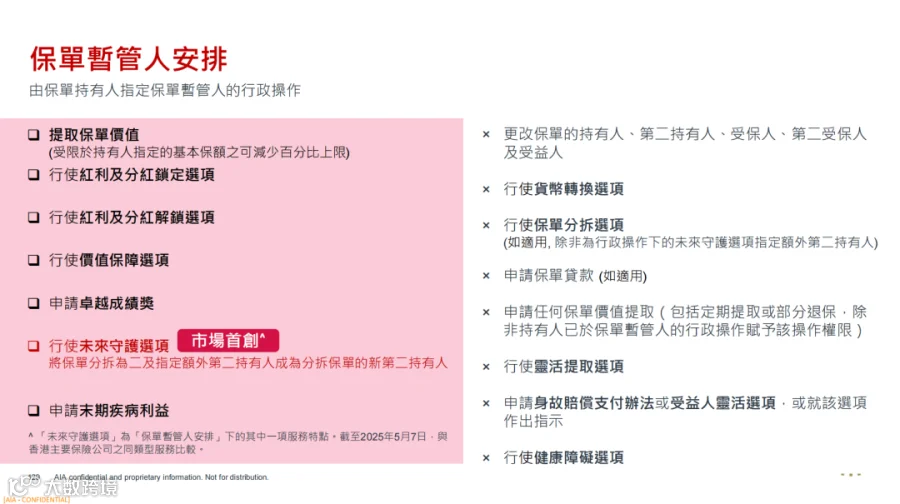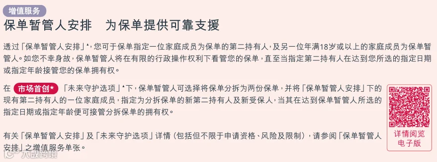 在此期间,保单暂管人将行使有限的保单权利,比如提取指定比例的保单价值、行使价值保障选项,但不得行使更改保单持有人、第二持有人、保单分拆、货币转换等选项。