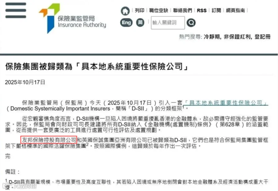 2025年10月,友邦更是被香港保监局评为“具本地系统重要性保险公司”(D-SII),也就是我们常说的 “大而不能倒” 的保险公司。