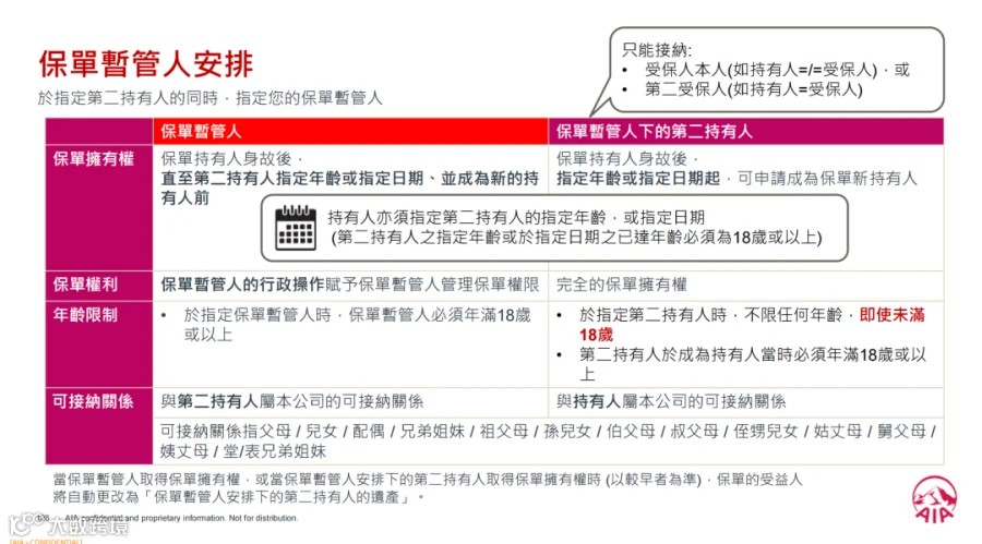当第二持有人未满18周岁,持有人身故后可由保单暂管人代持保单,直至指定年龄或者指定日期,由第二持有人继承保单。