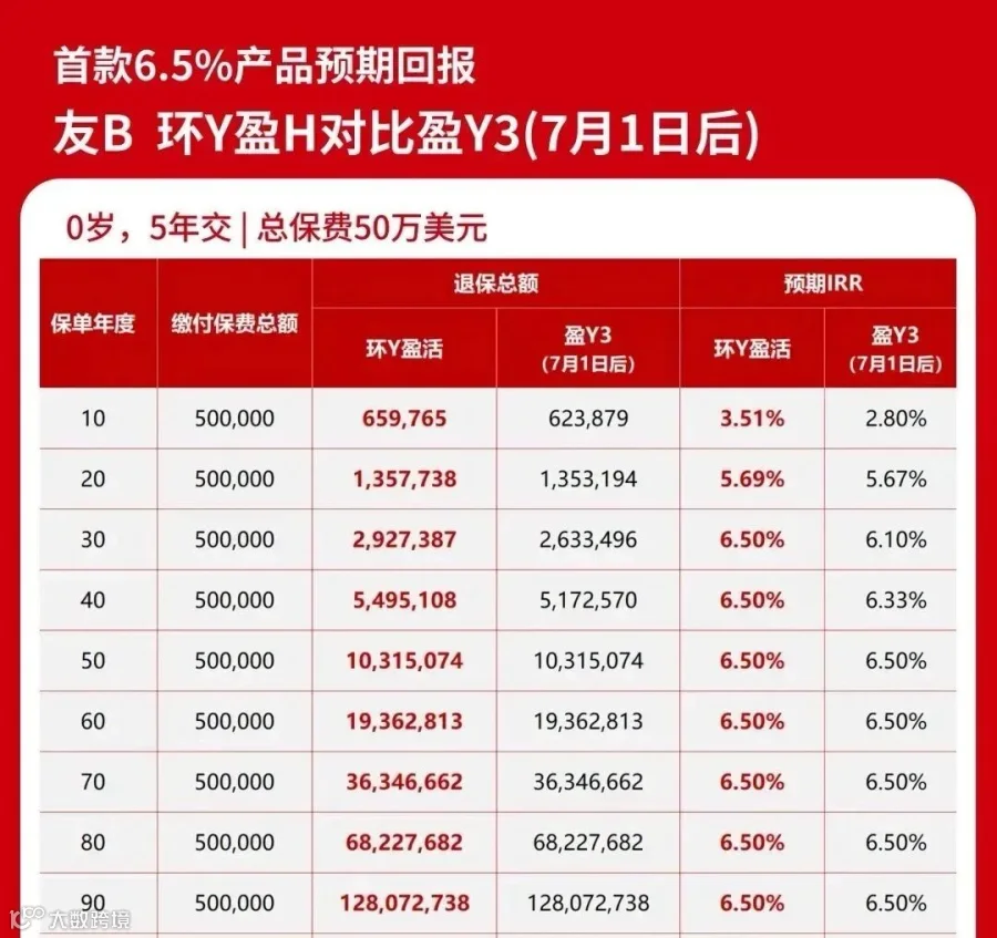 以5年缴费为例,「环宇盈活」在第7年就能预期回本,比友邦之前的「盈御3」还早一年。