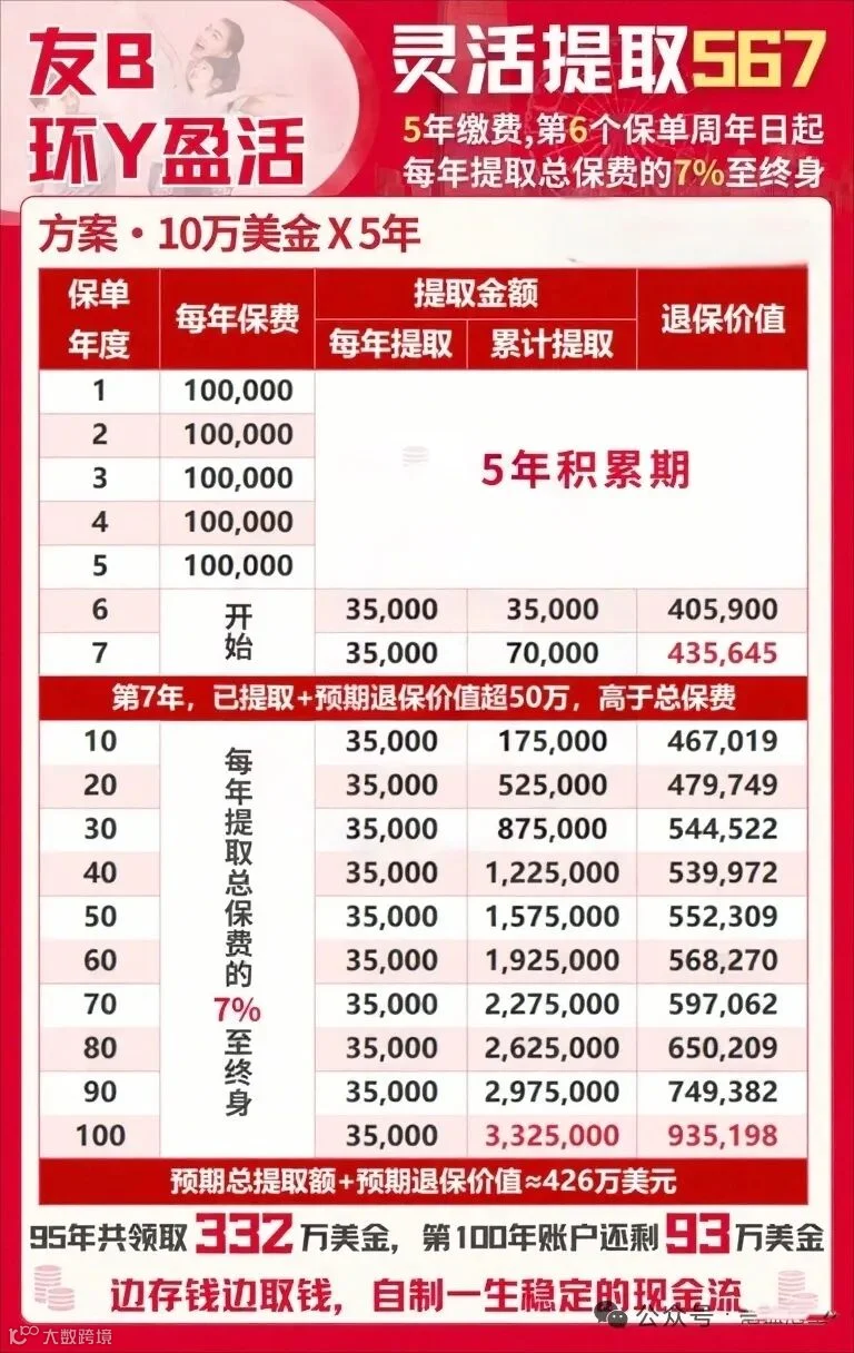 从第6年开始,每年领取35000美元(折合总保费的7%),领取后的现金价值仍会继续增长
