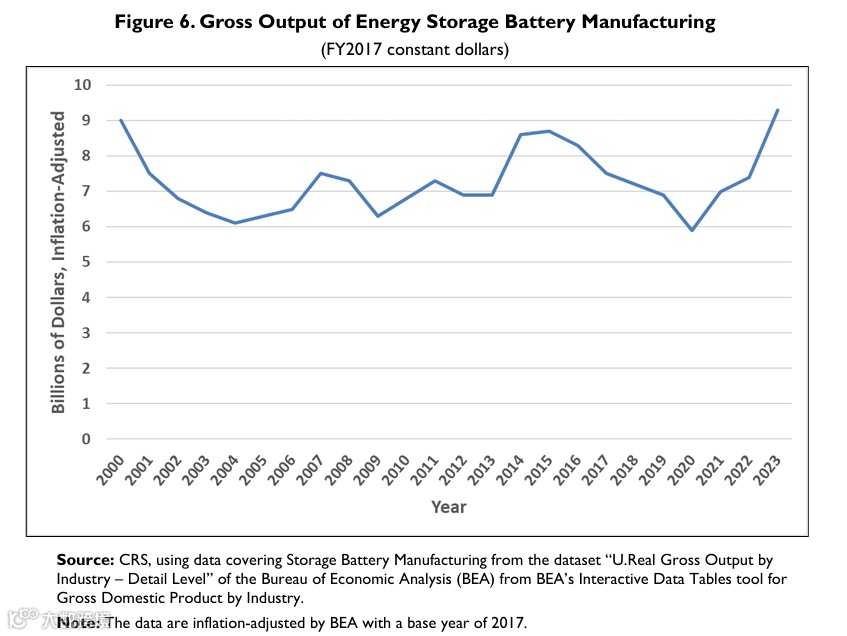 从2000年至2009年,随着美国经济呈现更广泛的去工业化趋势,本土电池制造业规模较前十年有所萎缩。此后自2009年起,部分电池制造活动出现增长,主要归因于车辆电气化、太阳能系统部署、锂离子电池成本下降及部分公共政策举措等因素。而随着美国对于本土电池产业的补贴以及制造业回流的长期政策导向,使美国电池产业从2010年开始景气向上。2020至2023年间,经通胀调整后的产值增长57.6%,达到至少自1997年以来的最高水平(Figure 6)。