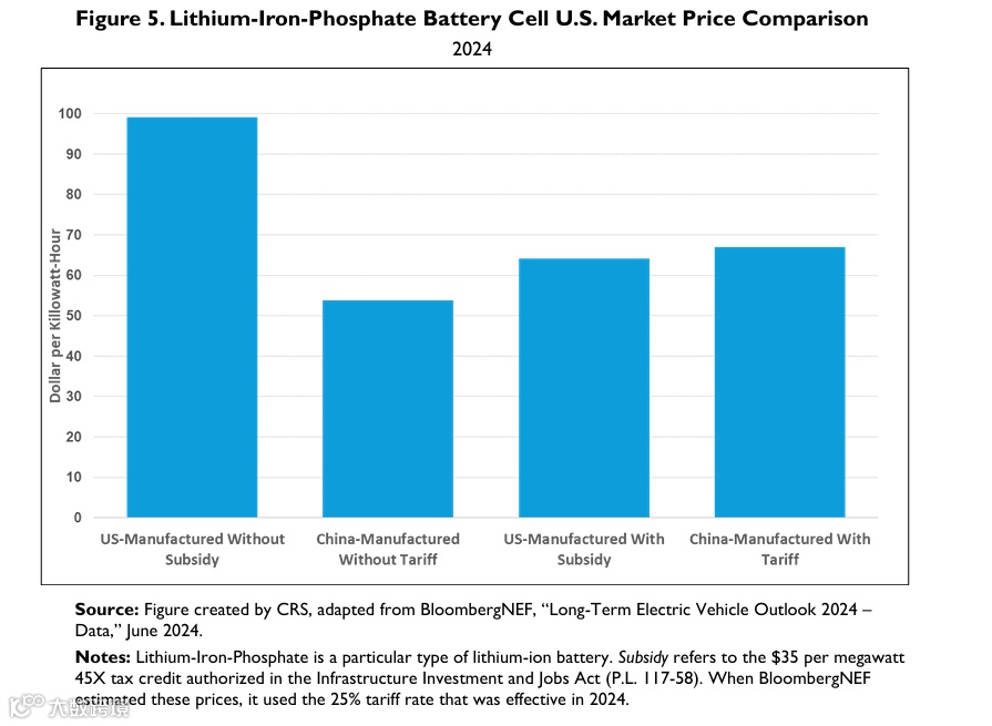 美国国会已经意识到对于中国锂电池进口依赖这个问题。他们的研究机构发现:美国本土制造的电池生产成本可能高于某些进口电池价格,国内补贴与关税叠加后可能抵消价差。例如,下图(Figure 5)展示了美国本土生产的电池与中国进口电池的价格对比。据彭博新能源财经预测,2024年美国国产锂电池价格比同等规格的中国进口电池高出约90%,若非美国补贴与关税政策,这种差距将更为显著。而如果美国对国产电池进行补贴同时对中国进口电池征收关税,美国的国产电池价格将得以维持和中国进口电池相比更具竞争力的水平。