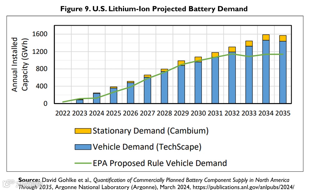 根据美国国会研究局(Congressional Research Service )的一份最新报告《Advanced Lithium-Ion Energy Storage Battery Manufacturing in the United States》(Update in July,2025),美国未来十年对于蓄能型锂电池的需求增长迅速。下图来源于阿贡国家实验室的一份研究数据,可以看到美国从2023年对锂电池的需求开始加速。2025年预计装机量达到400GWh,到2030年超过1000GWh,而到2035年附近,预计将达到1600GWh。其中,大部分的需求来自于车辆电动化。2024-2034十年复合增长率约15%。