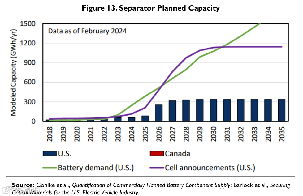 卡内基基金会同年报告亦指出,相较于电池组件产能,美国电池组件制造设施产能相对不足。预计未来产能将低于电池产能与需求的组件及材料包括:(1) 负极和正极材料(电极材料);(2) 集流体箔(铜箔铝箔或复合集流体);(3) 隔膜——这些均为先进锂离子电池的核心组件。特别是,集流体箔制造和隔膜制造领域,计划中的美国本土投资似乎明显落后于需求。