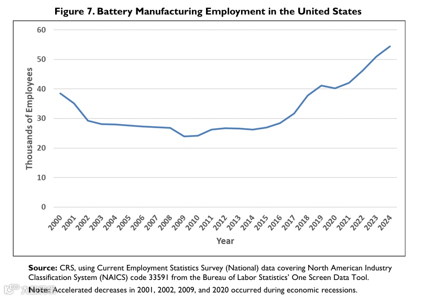从事电池制造业的人数也开始不断增长。根据美国劳工统计局(BLS)的统计数据,2024年电池制造业就业人数创下自1972年以来的最高纪录。该行业就业增长率自2015至2018年及2021至2023年期间持续加速(见下图Figure 7)。2024年增长势头延续,电池制造就业人数达到54,400人的历史新高。而同期整体制造业人数却出现下降。