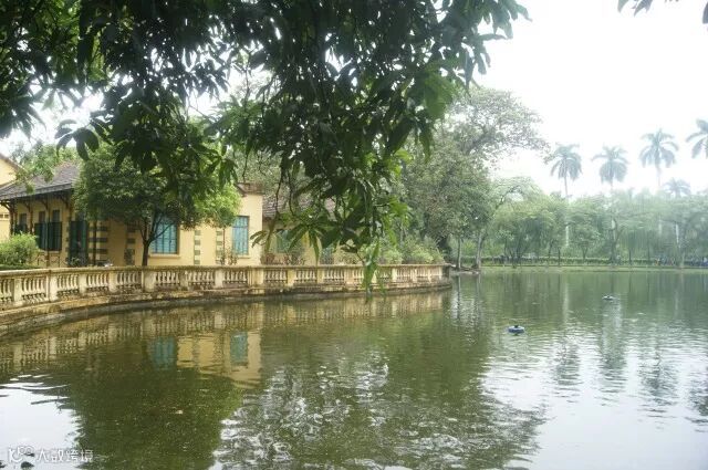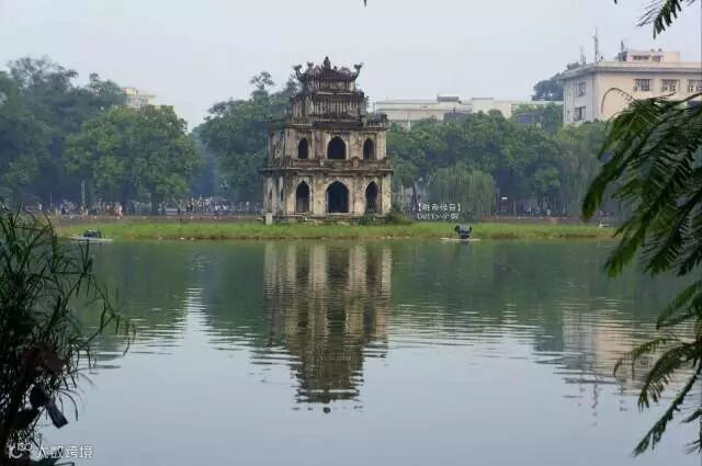 走出主席府不远,就看到一面湖像镜子一样地镶嵌在河内市中心,它叫还剑湖。相传古时,这座湖名为绿水湖,河里的神龟把一把宝剑赠送给越南古代开国皇帝李太祖,让他拿这把宝剑杀敌卫国,后来李太祖统一越南天下太平,就把这把宝剑还给神龟,所以这个湖就由绿水湖改名为还剑湖。