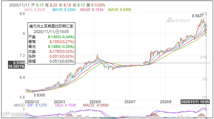 阿尔巴伊拉克出任财长后,土耳其里拉同年8月因美国制裁而崩盘,对美元汇率累计下滑45%;从今年年初至今,里拉对美元的汇率从5.9∶1贬值至约8.2∶1,贬值幅度超过30%。
