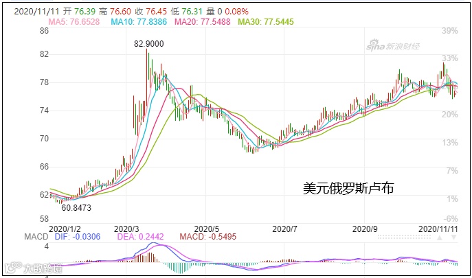 今年以来,俄罗斯卢布对美元已经暴跌20%。9月份,甚至成为了主要新兴市场中表现最差的货币,暴跌7.1%。11月2日,卢布对美元汇率一度跌破80关卡,无限接近3月以来最低值,那也是4年以来的最低点。