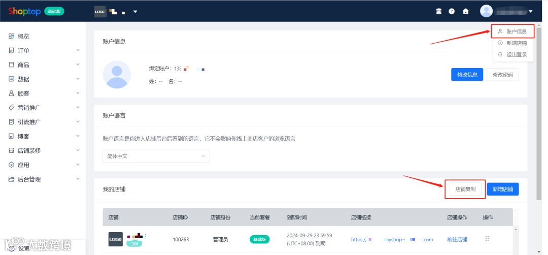 1、路径:【Shoptop管理后台】—【账户信息】—【店铺复制】