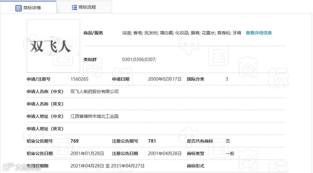 2000 年,江西双飞人关联企业抢先申请 “双飞人” 文字商标,2001 年获第 3 类化妆品类别注册,此时法国利佳尚未在大陆建立商标权利基础,为后续纷争埋下隐患。