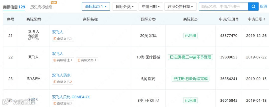 反观江西双飞人注册 144 个商标,构建起防御性商标矩阵。