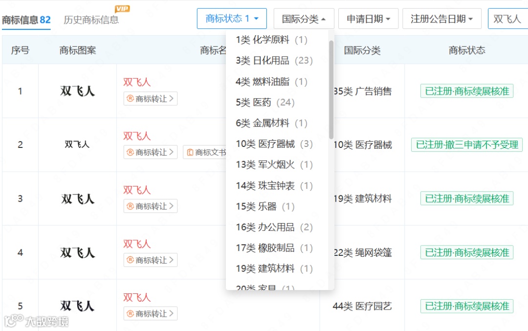 依托商标法 “申请在先” 原则,江西双飞人在 29 个类别注册“双飞人” 系列商标,构建起防御性商标矩阵,形成市场垄断。