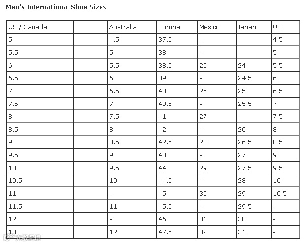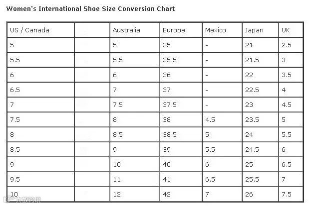 这是美国http://shoes.about.com提供的鞋码普遍对照表,基本上是很准确的,请注意我们平常所说的41、42指的就是表中的Europe(欧洲鞋码),你就拿Europe和US进行比对就可以了。
