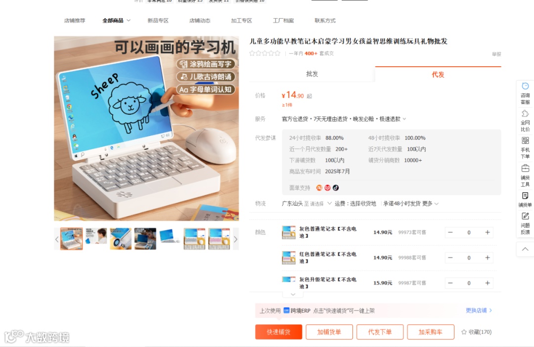 比如我们想卖玩具,我找到一款儿童学习机的玩具,我们要综合观察,这个店铺的厂家怎么样,发货物流快不快,厂家口碑怎么样,价格有没有性价比,如果觉得各方面都可以,我们就可以选择代发。