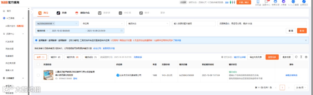 铺货成功之后,可以在1688铺货日记中找到铺货记录,铺货状态是显示铺货成功的