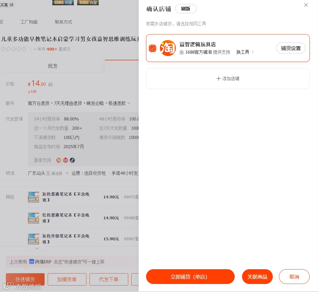 然后选择快速铺货,如果还没关联的店铺,可以选择关联,关联了之后选择官方铺货工具,点击立即铺货就可以了。