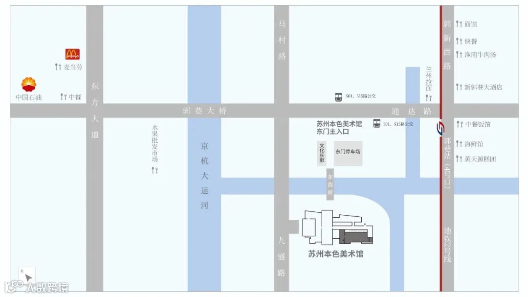 交通信息| 地铁2号线至郭巷站4号口,向北步行约500米,或乘坐501、515路公交郭巷大桥南下,步行6分钟即可达到。本色美术馆东门为唯一入口,停车场也在东门,由于停车位有限,建议大家乘坐公共交通工具,绿色出行。