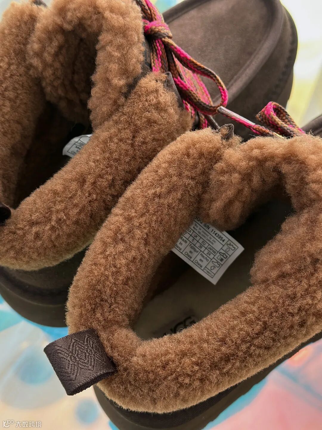 同专柜的羊皮毛一体,选用隆丰皮草的A级原料,毛体密度高,毛长均匀,轻度防泼水,小雨小雪不惧怕。原厂橡胶组合大底,耐弯折,哪怕零下50度依旧有突出的柔软感,能给我们提供更好的隔热保暖防寒性,且抓地力强,防滑减震。