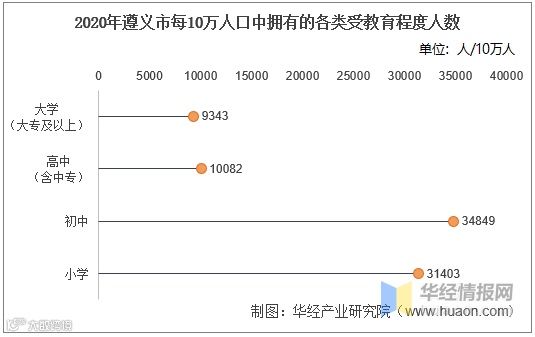 教育程度数据显示,2020年遵义市每10万常住人口中,拥有大学(大专及以上)文化程度的为9343人,高中(含中专)为10082人,初中为34849人,小学为31403人[k]。