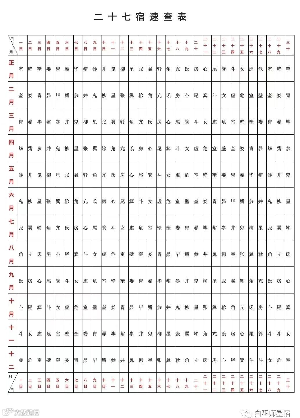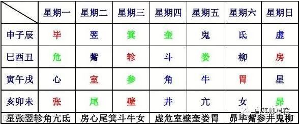 也就是将这两个值日星宿,代入到上面二十七星宿关系查询表中,且将二十八星宿中多一位的【牛宿】统一归到【女宿】当中去查询。