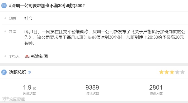 “加班不满30小时捐300元”这句话让许多跨境工作者炸毛了。该帖子在微博上被广泛传播,话题累计阅读量高达1.9亿次。