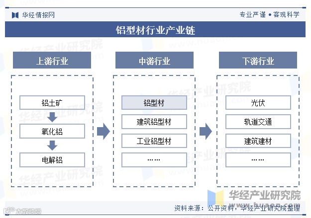 铝型材产业链上游为铝土矿经提炼形成氧化铝,再电解制成电解铝;中游为电解铝添加合金元素后通过挤压、延压等工艺加工成各类铝型材;下游广泛应用于建筑建材、光伏、轨道交通、汽车轻量化等领域[k]。