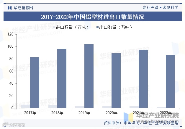 我国铝型材以出口为主,贸易规模波动较大。2022年,铝型材进口量为2.26万吨,出口量达86.61万吨,显示出较强的国际市场竞争能力[k]。
