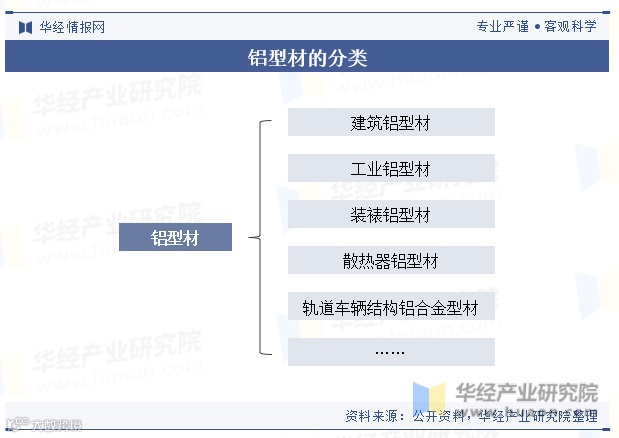 铝型材是通过高压将铝棒经模具挤压成型,形成具有特定截面形状和尺寸精度的铝材料,其生产工艺主要包括铸造、挤压和表面处理。按用途可分为建筑铝型材、工业铝型材、装裱型材、散热器型材及轨道交通用铝合金型材等类别[k]。