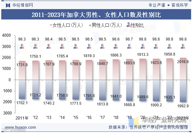 根据华经产业研究院数据,2023年加拿大总人口达4009.78万人,较上年增长115.87万人,年度增长率2.93%。与2011年相比,累计增长575.85万人。当年净移民人数为24.97万人,较2022年的24.86万人略有上升[k]。