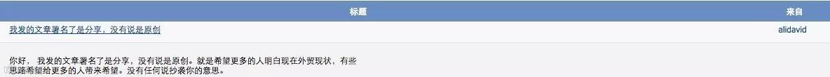但对方回复的站内信称:“我发的文章署名了是分享,没有说是原创……没有任何抄袭你的意思。”[k]。